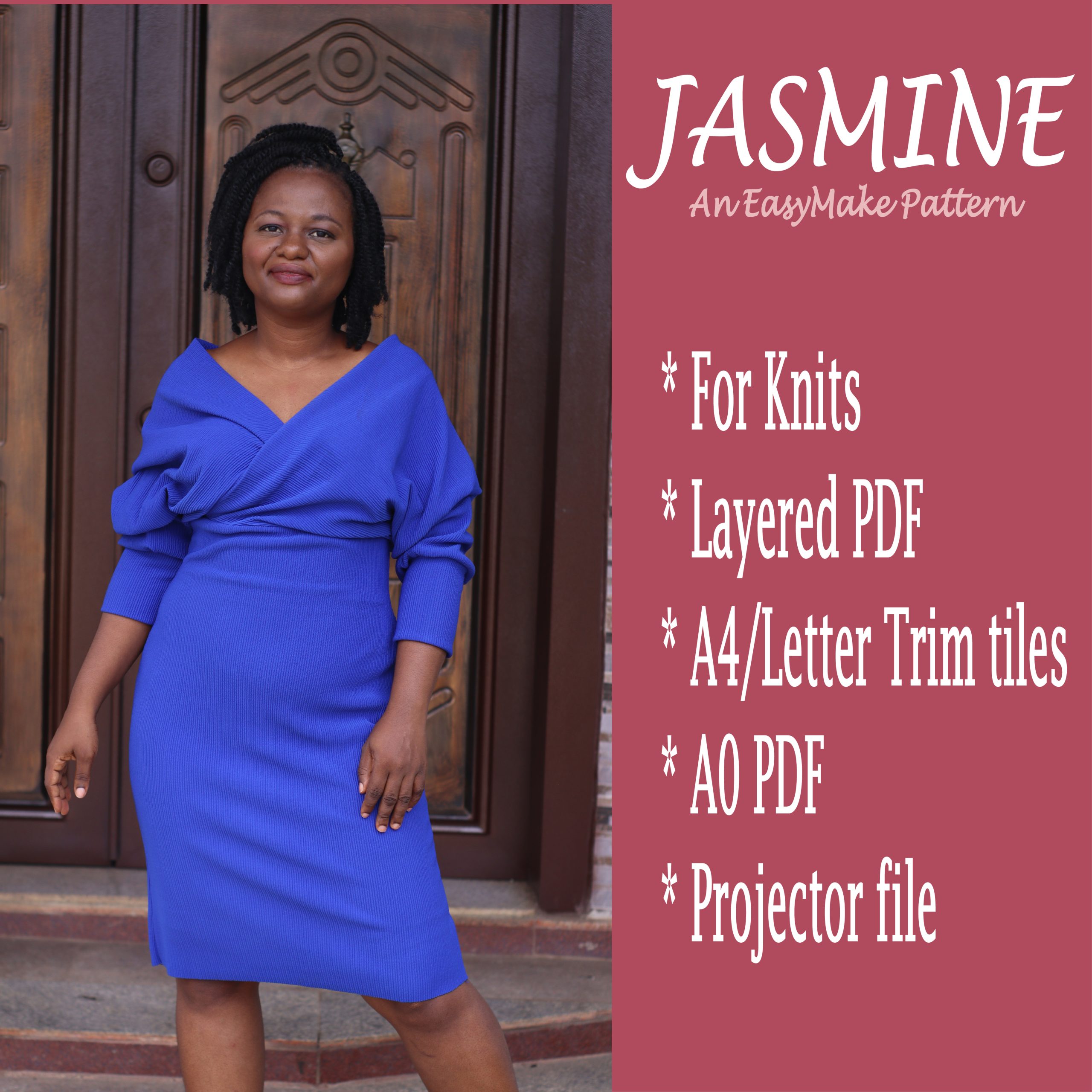 Jasmine is a versatile pattern for knit fabrics. This grown-on sleeve style is loose at the upper bodice but fitted through the under-bust, waist and hip, ensuring a flattering silhouette. The bodice features a surplice neckline that can be worn front-to-back or back-to-front, as the front and back views are identical.